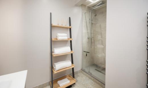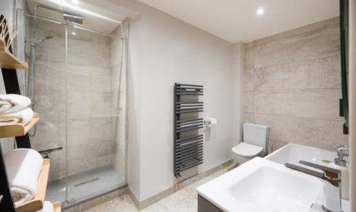 - 1 bathroom with bath, walk-in shower, WC & sink